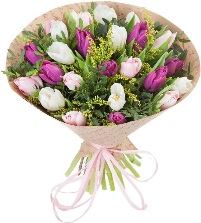 2 белых тюльпана, 2 розовых тюльпана, 3 малиновых тюльпана, 1 солидаго, зелень, упаковка, лента4 белых тюльпанов, 4 розовых тюльпанов, 5 малиновых тюльпанов, 2 солидаго, зелень, упаковка, лента8 белых тюльпанов, 8 розовых тюльпанов, 7 малиновых тюльпанов, 3 солидаго, зелень, упаковка, лента